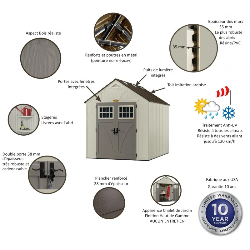 Facile à monter, grâce à un système sans vis, l’abri de jardin Suncast est durable. Ne nécessitant pas d’entretien particulier, vous le conserverez dans votre jardin pendant de longues années. Il est d’ailleurs garanti 10 ans, preuve de la grande qualité du produit.