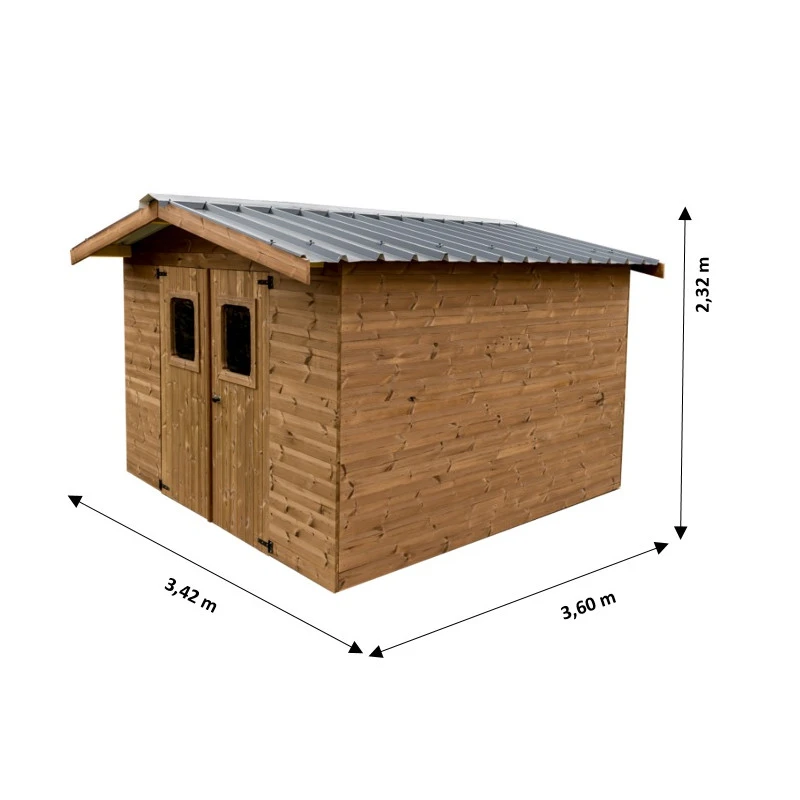 Les dimensions au sol de 3x3m offrent un bel espace de rangement pour l’outillage du jardin, les deux roues ou comme petit atelier d’appoint. La large double porte, équipée de deux lucarnes fixes au vitrage PVC et munie d’une serrure à clé, fournit un passage confortable pour les personnes ou lors du rangement d’objets encombrants.