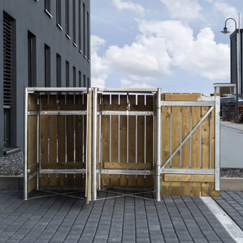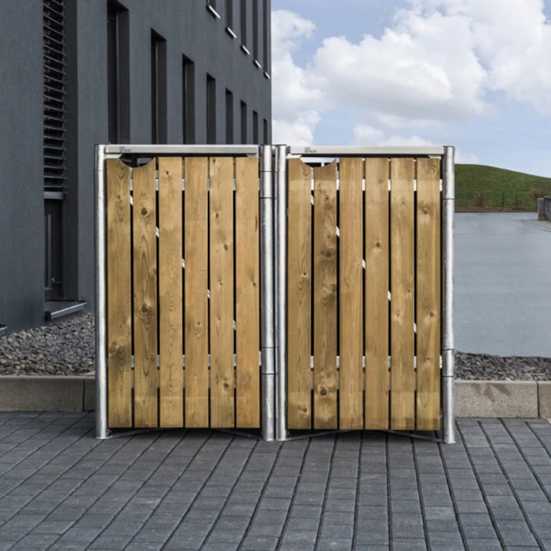 Ce cache-poubelles Hide à double compartiment est une solution qui mêle esthétisme et grande fonctionnalité. Cadre en acier galvanisé à chaud et parois en planchettes de pin traité. L’aspect du bois naturel s’intègrera harmonieusement dans votre aménagement extérieur et les lignes épurées du cadre apportent une touche moderne et élégante.