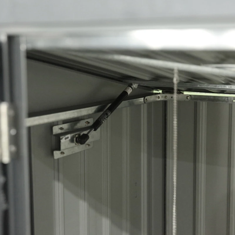 L’ouverture peut s’effectuer par une large double porte (150x127cm) situé sur la face avant pour sortir la poubelle ou en soulevant le couvercle pour une utilisation régulière. L’ouverture du couvercle est facilitée par un vérin, et elle provoque l’ouverture automatique du couvercle de la poubelle au moyen d’une chainette avec crochet. La toiture monopente est dotée d’une pente accentuée pour faciliter un écoulement optimal de l’eau de pluie et une évacuation naturelle de l’amas de neige. Elle peut supporter une charge de neige maximale de 100kg/m².