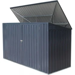 Cet abri métallique est prévu pour accueillir deux poubelles de 240L. Réalisé en tôle galvanisée d’une épaisseur de 0,3mm très durable, robuste et résistant aux intempéries. Le revêtement de qualité ne craint pas les rayures, en couleur de gris anthracite. Conçu pour une utilisation en extérieur, ce modèle très robuste possède un cadre en acier avec renforts diagonaux en profilés dans les coins.
