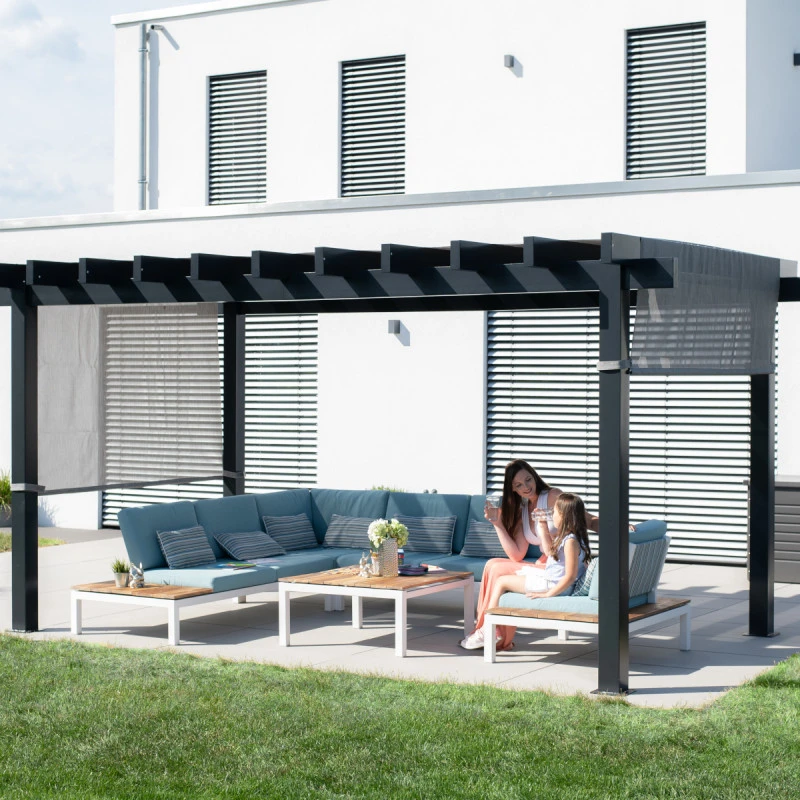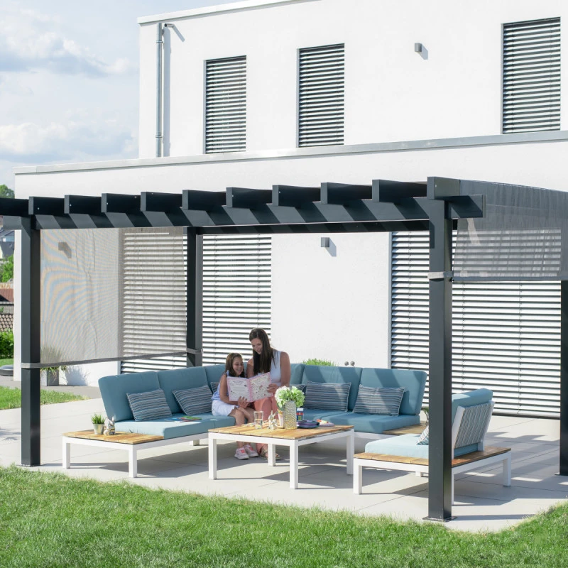 La pergola Yamba apportera une touche exclusive à votre aménagement extérieur. Avec sa structure autoportante robuste constituée de 4 poteaux de 12cm de section, elle deviendra un élément central de votre décoration et vous fournira une ombre salutaire sous laquelle vous pourrez passer des moments inoubliables en famille ou entre amis. Les éléments en aluminium sont thermolaqués pour une finition impeccable et une résistance exceptionnelle à la corrosion.