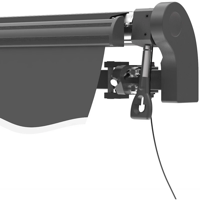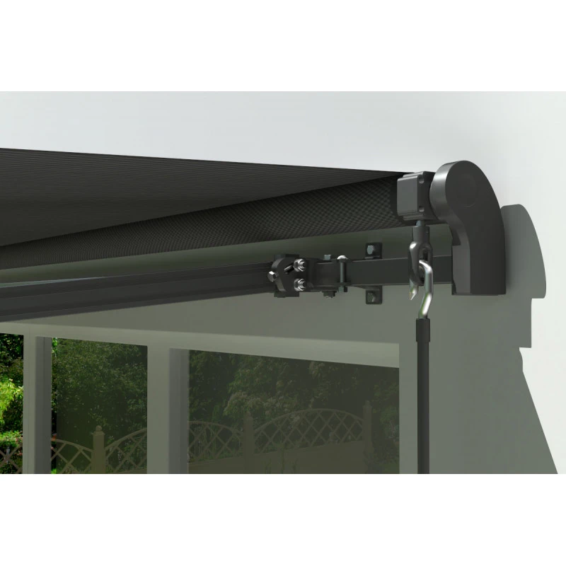 Esthétique, la toile grise anthracite unie en polyester 280gr/m² enduite PU s’accorde parfaitement bien avec sa structure métallique anthracite. L’ensemble, aux tons contemporains, reste très discret.